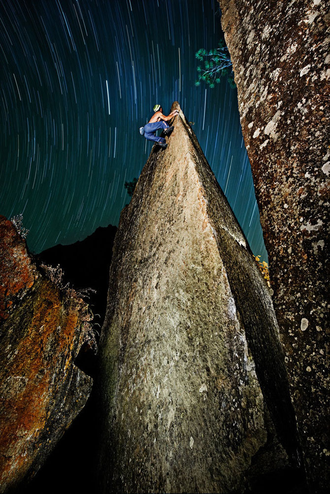Снимок был сделан во время похода по валунам в Индийской части Гималайских гор. Бернд взобрался на валун высотой 15 метров, а все остальные смотрели на это искусное действо, затаив дыхание. После того, как он спустился вниз, фотограф сделал несколько снимков звездного неба на долгой выдержке, после чего совместил две фотографии и получил этот снимок.