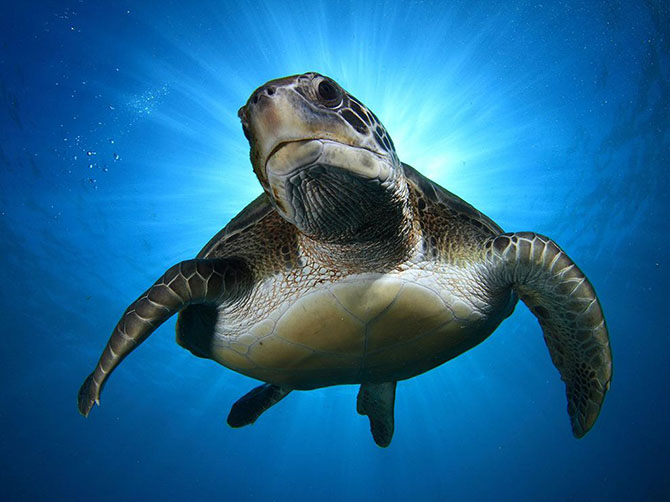 Зеленая черепаха на побережье Тенерифе на Канарских островах. Зелёная черепаха — крупная, длина панциря от 80 до 150 см, масса — от 70 до 200 кг, очень редко достигает длины 200 см и массы 400—500 кг. Несмотря на название, окраска зелёной черепахи сверху не только оливково-зелёная, но и часто тёмно-коричневая, с желтоватыми и белыми пятнами и полосами.