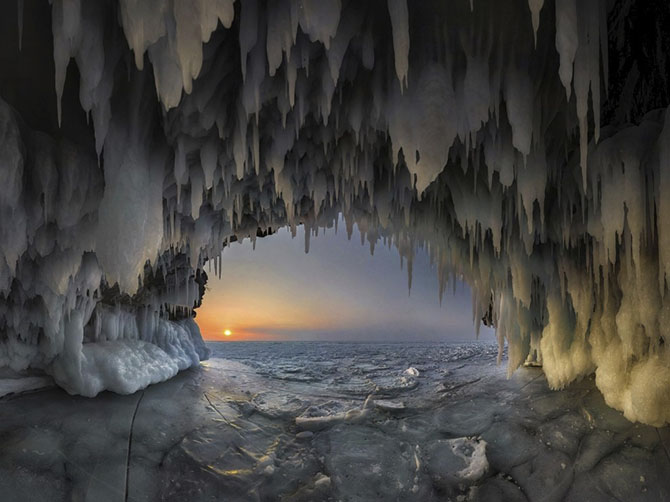 Ледяной грот, Байкал. «Ледяные гроты острова Харанцы на Байкале давно уже стали визитной карточкой зимнего Байкала, — пишет автор фото Андрей Грачев. — Этой фотографией хотелось одновременно показать и красоту, и масштаб ледяного грота. Эта фотография — результат сшивки 14 кадров».