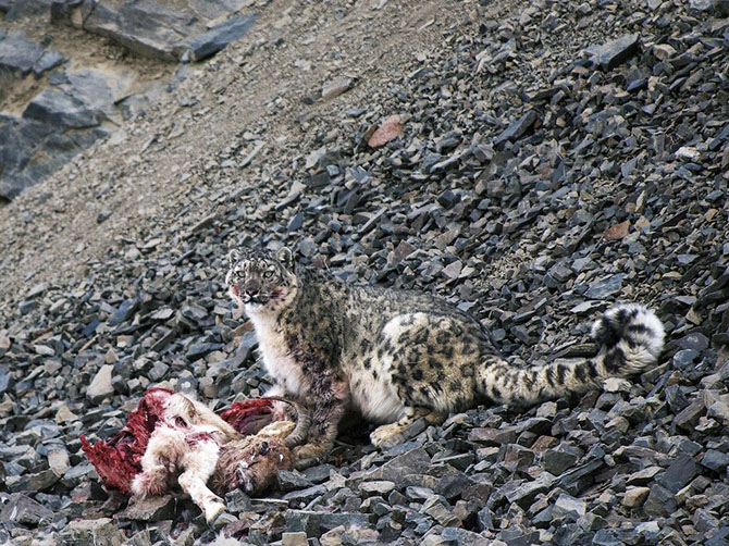 Ирбис с добычей, Монголия. Основная пища снежных барсов — горные козлы, или козероги. Кроме них ирбисы охотятся на кабаргу, зайцев, сусликов, сурков и даже на птиц. Известны случаи, когда ирбисы нападали на медведей.