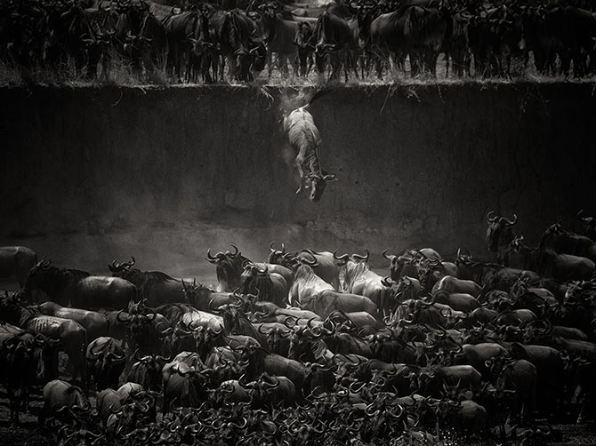 Прыжок. Антилопы гну пересекают реку Мара в Танзании во время ежегодной миграции из Танзании в Кению. В воде их поджидают огромные крокодилы…