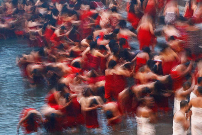 Непальские индуисты совершают омовение в водах реки Багмати в Катманду, Непал, 30 января 2014 года.