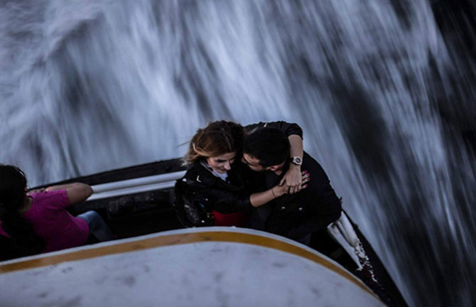 Люди плывут на пароме в проливе Босфор, Стамбул, Турция, 17 октября 2014 года.