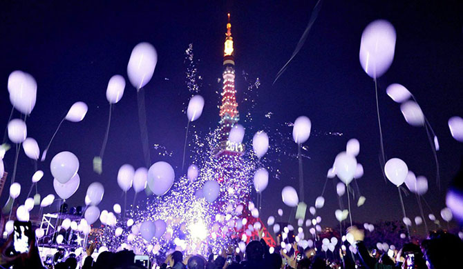 Люди отпускают воздушные шарики во время церемонии обратного отсчёта в новогоднюю ночь в Токио, Япония, 1 января 2014 года.