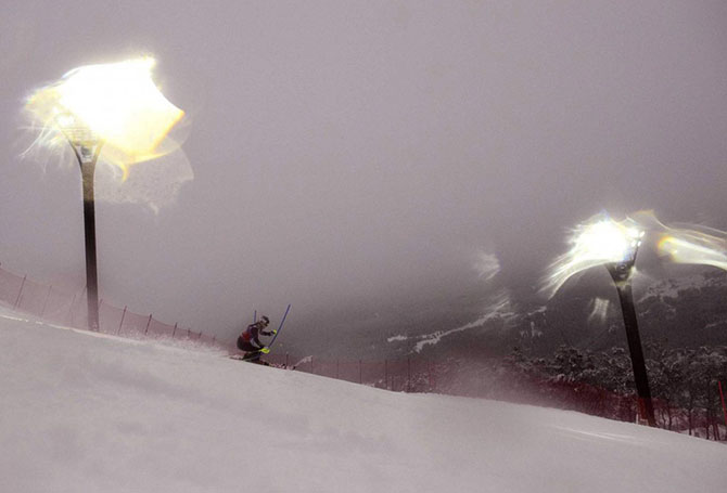 Американка Микаэла Шиффрин выступает в слаломе на Кубке мира по горнолыжному спорту в Бормио, Италия, 5 января 2014 года.