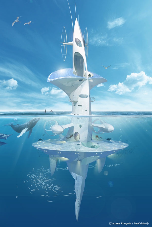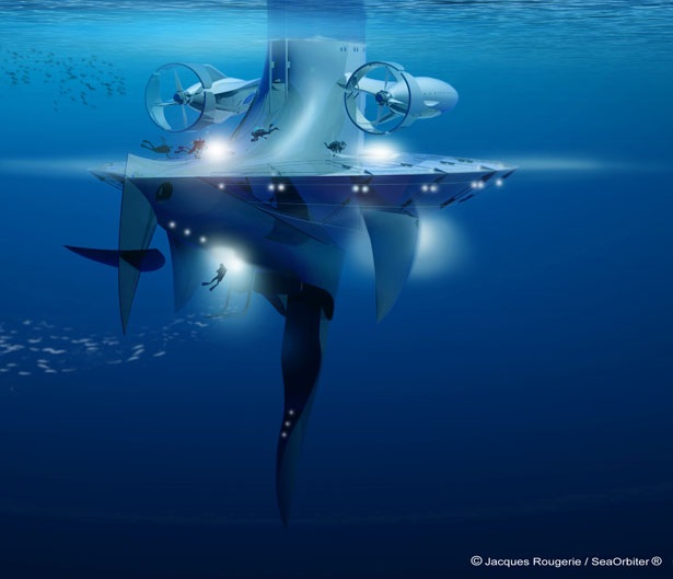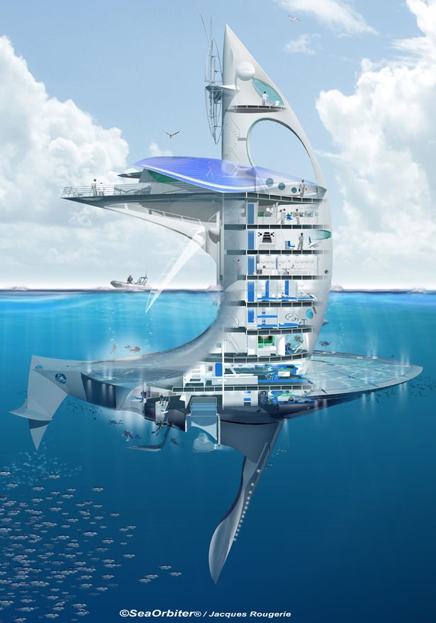 Корабль SeaOrbiter, напоминающий жилой небоскреб, имеет высоту 51 метр и способен разместить у себя до двадцати двух человек, которые смогут работать под водой 24 часа в сутки.