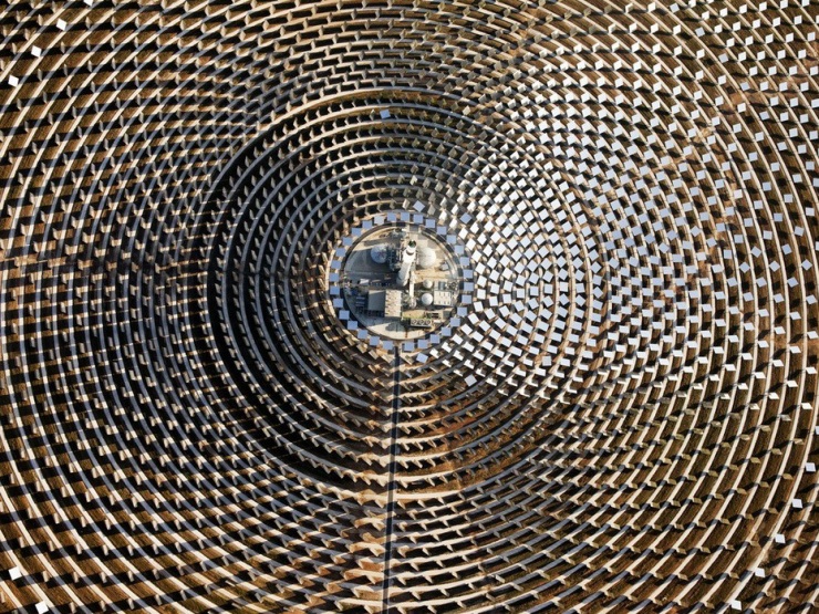 3. Gemasolar состоит из тысяч квадратных метров зеркал (а не солнечных батарей). Эти зеркала используются для концентрации солнечного света в одной точке, работая как огромное увеличительное стекло. Затем жидкость, которая течет мимо точки концентрации лучей, нагревается до сотен градусов по Цельсию и использует тепло для питания турбин.