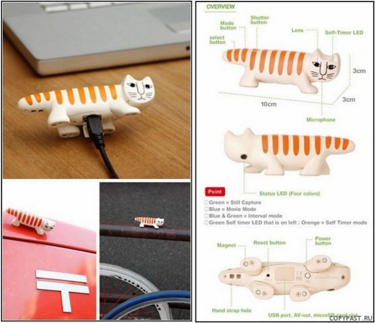 Фотокот Necono – камера, которую довольно трудно заподозрить. Тем не менее, она снимает фото в разрешении 2048 на 1536 пикселей, или видео размером 1024 на 768 точек. В одном глазу у котейки фотокамера в 3 мегапикселя, а в другом — сенсор. Магниты на лапках позволяют установить камеру хоть на лестнице, хоть на автомобиле, хоть на уличном фонаре.