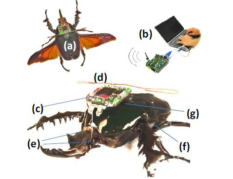 Комплекс дистанционного управления жуком (упрощённо): a) жук-киборг, b) ноутбук с подсоединённым через USB радиопередатчиком, c) приёмник, d) антенна, e) стимулирующие правый и левый «лобовые» электроды, f) летательные мускулы g) контрэлектрод (фотографии MEMS 2009 Technical Digest).