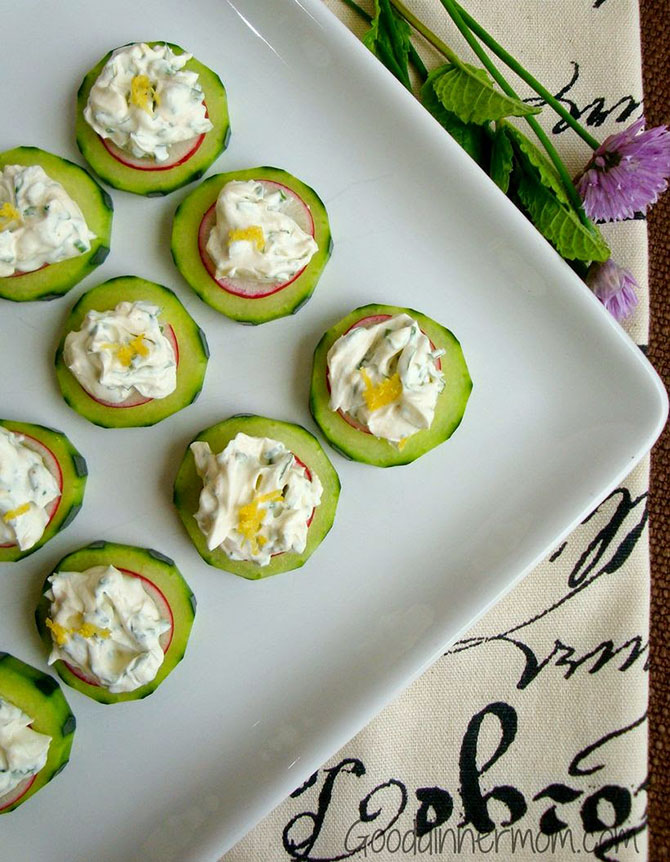 Для приготовления закусок вместо крекеров возьмите хрустящие овощи: кабачки, морковь, огурцы, свёклу. Например, ломтики огурца можно намазать мягким сливочным сыром.