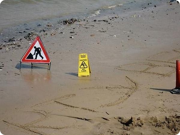 Знак, предупреждающий о том, что здесь мокрый песок, пожалуй, самый странный изо всех выше перечисленных. Однако, тем, кто его установил, пожалуй, будет виднее.