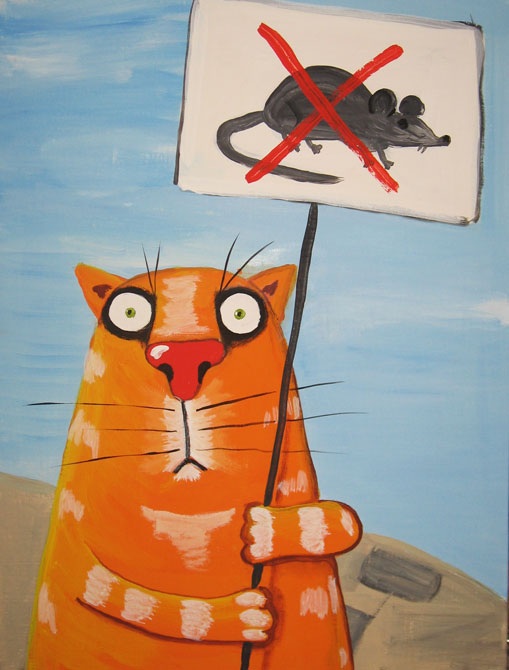 Тут хочу пояснить, что кот протестует против крыс, потому что они не вкусные, а не против мышей. Ну и в целом выступает за здоровую пищу.
