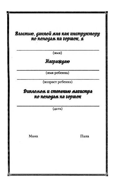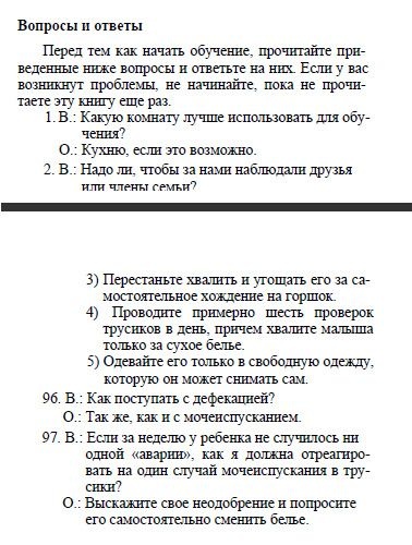И вот, когда читатель окончательно сломлен и понимает, что ребенка срочно нужно приручить к горшку и лишь эта книга его спасет, авторы переходят к самому главному.Ставим горшок на кухне и запасаемся напитками. Их понадобится много! Авторы не уточняют — стоит запасаться напитками только для ребенка или родители тоже могут себе взять чего-нибудь на время обучения...