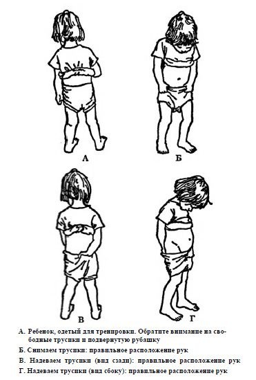 Теперь тренировка.Снимание-надевание трусов.Главное помнить — где коричневое — зад, где желтое — перед.