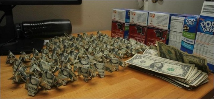 Он очень возмутился размером штрафа и решил выплатить его наличными в полицейском участке. Заявившись туда, он вручил служащему две коробки из-под пончиков. Внутри коробок были 137 свинок, аккуратно сложенных из одно-долларовых банкнот.