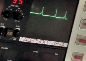 Тут же, на сугубо медицинском приборе, да еще и показывающем «кардиограмму» (к реальной, кстати, не имеющую никакого отношения), ни к селу ни к городу написано «ЛАЗЕРНОГО ЛУЧА».