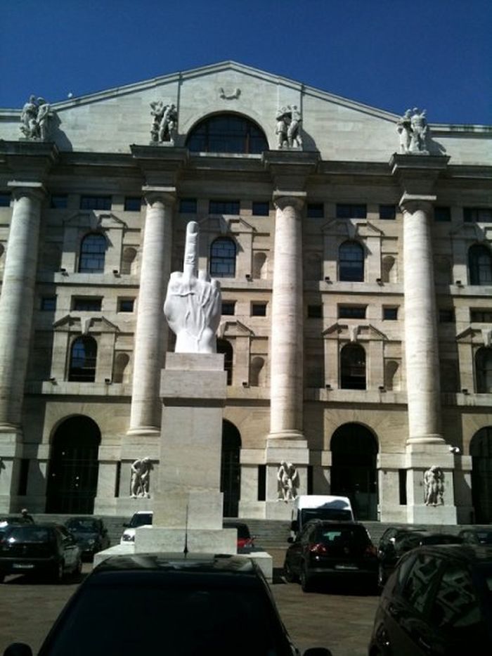 5. 4-метровый мраморный кулак с поднятым вверх средним пальцем обращен к финансовым воротилам. Милан, Италия
