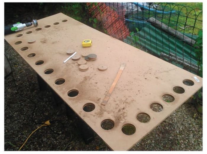 Берем кусок фанеры, вырезаем так, чтобы было похоже на дверной проем и по периметры делаем отверстия.