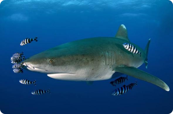 17. Белоперая акула в окружении рыбы-лоцман в Красном море. (Daniel Selmeczi/Steve Bloom / Rex Features)