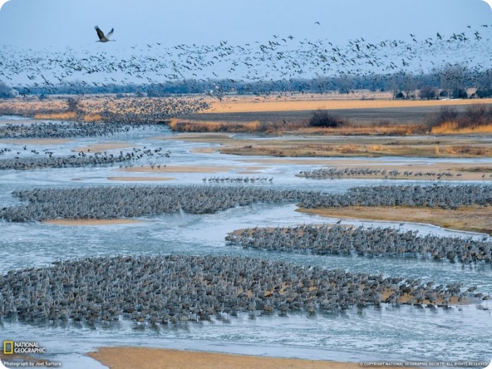 5. Канадские журавли на реке Платт. Каждый год около полумиллиона канадских журавлей останавливается на отдых на реке Плат в Небраске, чтобы подкормиться червяками, остатками кукурузы и тем, что найдут на окрестных полях. Журавли отдыхают во время весеннего перелета, по пути из Мексики и южных штатов США на север. (Photograph by Joel Sartore)