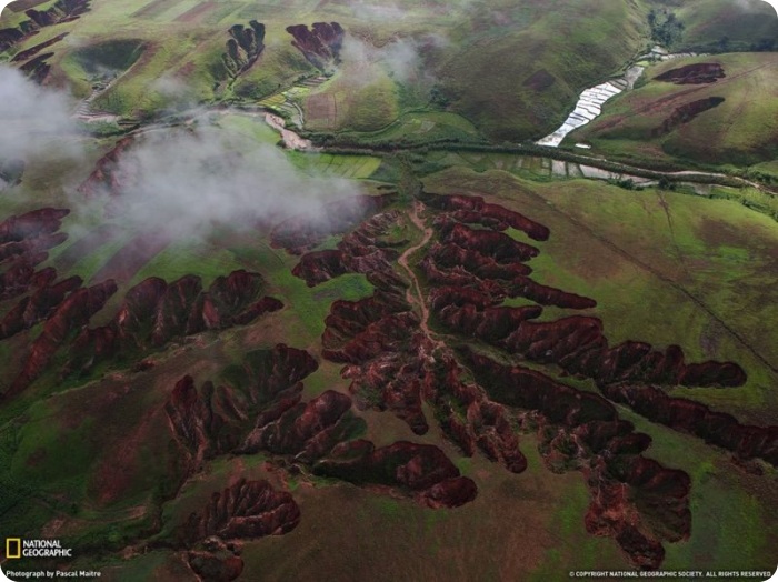 7. Эрозия почвы на Мадагаскаре. Эрозия почвы на Мадагаскаре образовала узор, похожий на жилки на поверхности листьев. Эрозия – одно из последствий незаконной вырубки палисандрового леса, ценной породы красного дерева. (Photograph by Pascal Maitre)