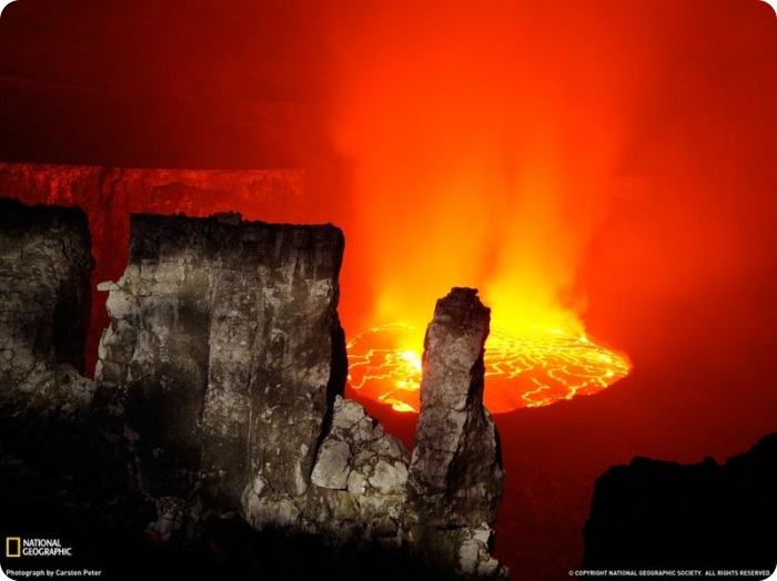 13. Кипящая лава вулкана Нирагонго в Конго. В кратере вулкана Нирагонго находится одно из самых больших и наименее изученных лавовых озер, более 200 метров в длину, а глубина его составляет, возможно, несколько километров. Уже дважды потоки лавы вырывались из озера и текли по направлению к находящемуся неподалеку городу Гома. (Photograph by Carsten Peter)