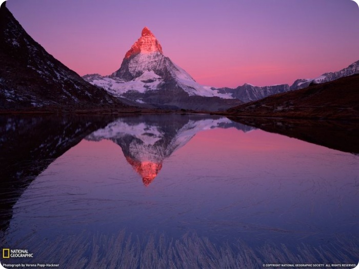 11. Гора Мэттерхорн в лучах рассветного солнца, отражающаяся в водах озера Рифель поблизости от Церматта, Швейцария. (Photograph by Verena Popp-Hackner)