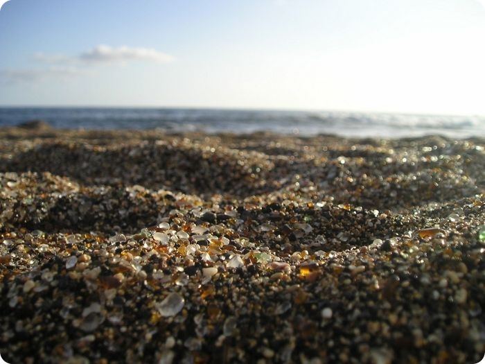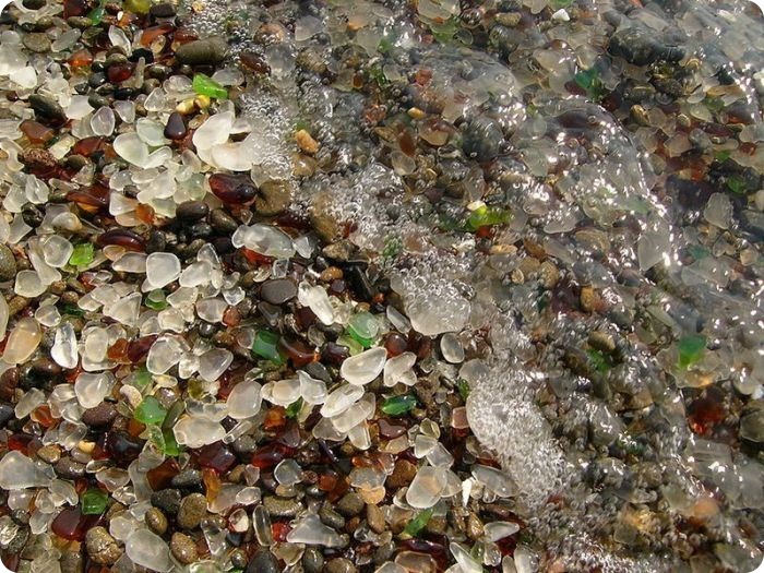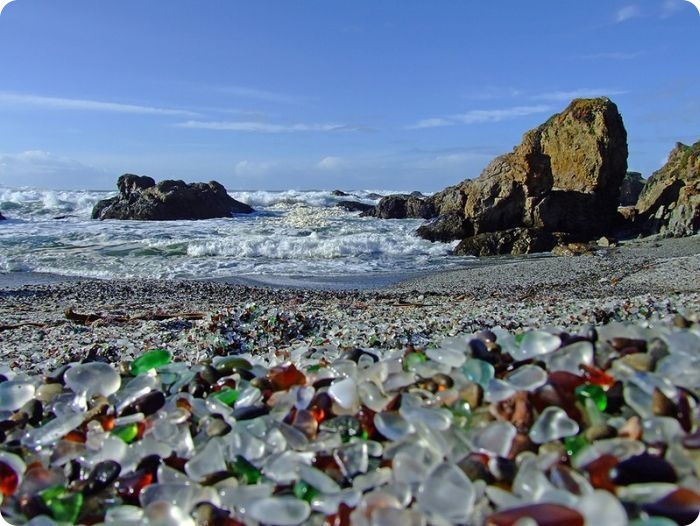 Есть одно интересное местечко — Glass Beach, Fort Bragg, California, USA (Стеклянный пляж, Форт Брэгг, Калифорния, США). Удивительно это место своим необычным пляжем. В первой половине XX века на территории, где находится этот пляж, была свалка. В 60-е годы свалку закрыли, и с тех пор мусор был предоставлен самому себе. Горы битого стекла, пластмассы и прочего мусора так и валялись на берегу под теплыми калифорнийскими лучами, омываемые морскими прибоями и обдуваемые морскими бризами.