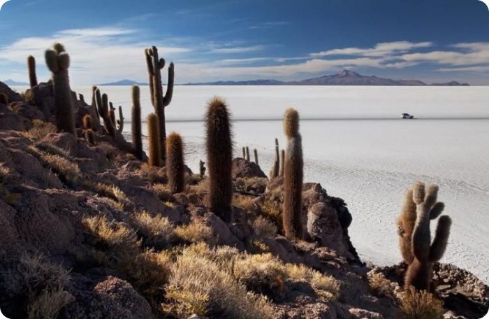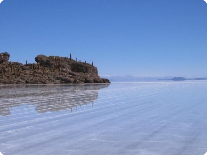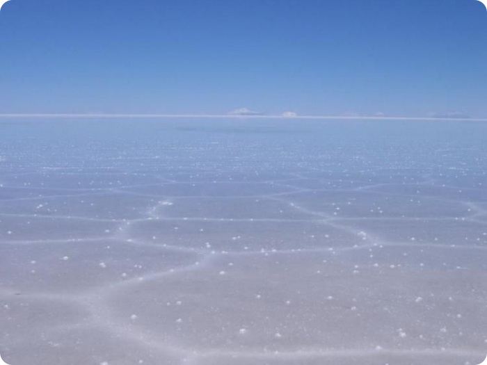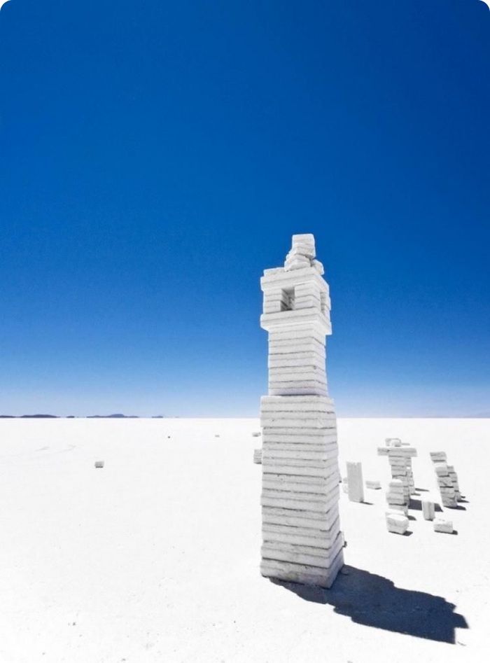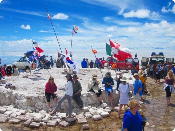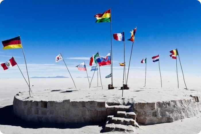 В центре соляных равнин есть соляной отель, а рядом вот такое сооружение из соляных блоков, где приезжающие со всего мира туристы размещают флаги своих государств. Какс видите, есть и российский флаг.