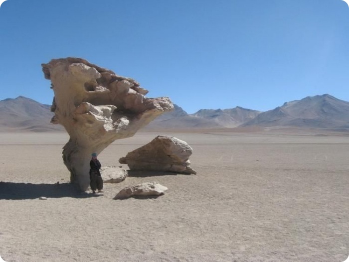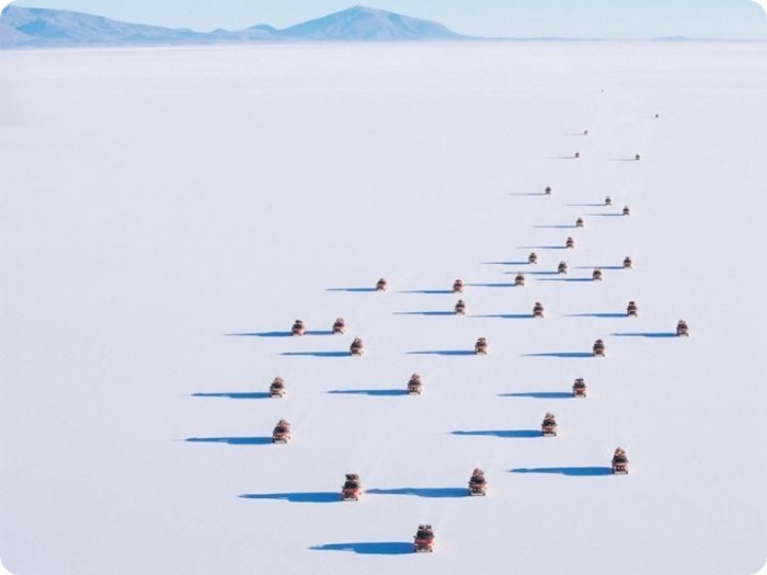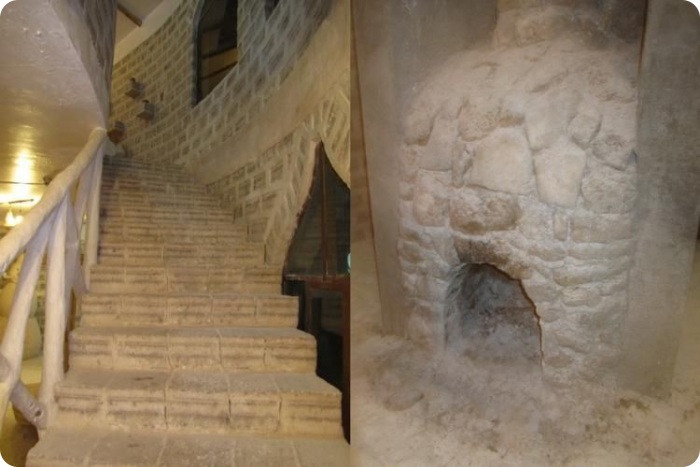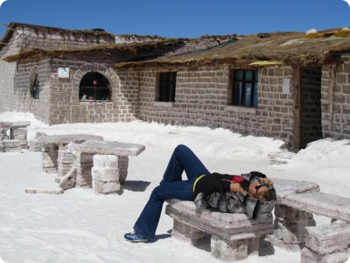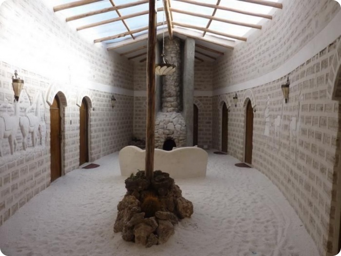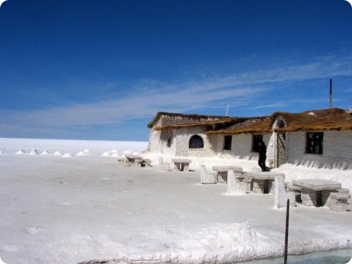 Отели здесь строят из соли, точнее, из соляных блоков. Столы, стулья, кровати и прочие предметы обстановки тоже сделаны из соли. А на стенах висят объявления с вежливой просьбой ничего не облизывать. Переночевать в таком отеле можно за 20 долларов.