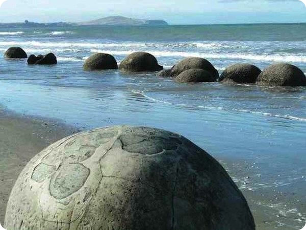 Наиболее известная коллекция подобных яиц расположена в одной рыбацкой деревушке в Новой Зеландии. Шары лежат прямо на пляже. Причем все камни имеют различную структуру — одни из них безупречно гладкие, другие — словно панцирь черепахи, шершавые. Некоторые — расколоты на части или с огромными трещинами.