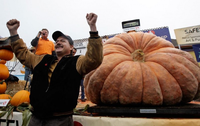 31. Леонардо Урена радуется после того, как выращенная им тыква была объявлена победительницей на фестивале гигантских тыкв в Халф Мун Бей, Калифорния, в понедельник, 10 октября 2011 года. Вес тыквы-рекордсменки составляет 772 килограмма, диаметр — 4,95 метра. (AP Photo/Paul Sakuma)