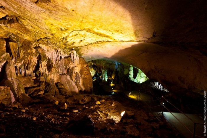 14. Вскоре мы попадаем в Зал Перестройки — один из крупнейших оборудованных залов Европы и самый крупный зал в пещерах Крыма, длина его более 100 метров, высота 28 метров. Сюда поместится девятиэтажный дом!