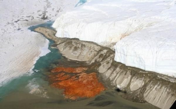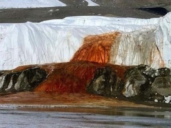 Солёная вода, богатая железом, периодически выходит из небольшой трещины в Ледник Тейлора. Источником воды для «Кровавого водопада» является озеро, удалённое на несколько километров от водопада и покрытое ледником толщиной в 400 метров. Это озеро появилось после отступления морской воды, покрывавшей Сухие долины, и наступления льда 4 — 1,5 миллиона лет назад. Уровень мирового океана 5 миллионов лет назад был намного выше, чем сейчас. Солёность воды в озере превышает солёность мирового океана в четыре раза, поэтому вода в водопаде не замерзает даже при минус 10 градусах по Цельсию.