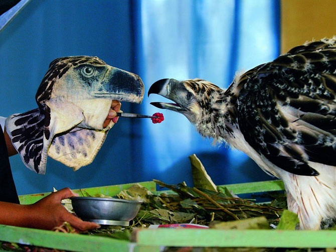 Филиппинский орленок. Участники программы по разведению орлов в неволе надевают на руки игрушечные орлиные головы, чтобы птенцы не принимали людей за своих родителей.