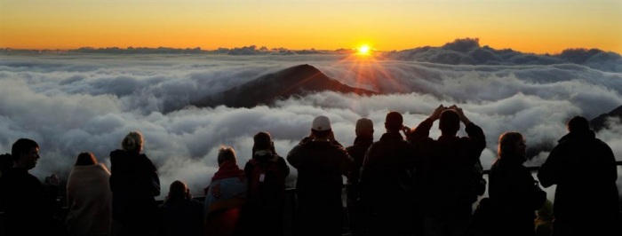 12. Туристы встречают рассвет на высоте более 3 тысяч метров в Национальном парке Халеакала на острове Мауи, штат Гавайи. При благоприятных погодных условиях посетители могут увидеть с этой вершины три других гавайских острова. (The Washington Post via Getty Images)