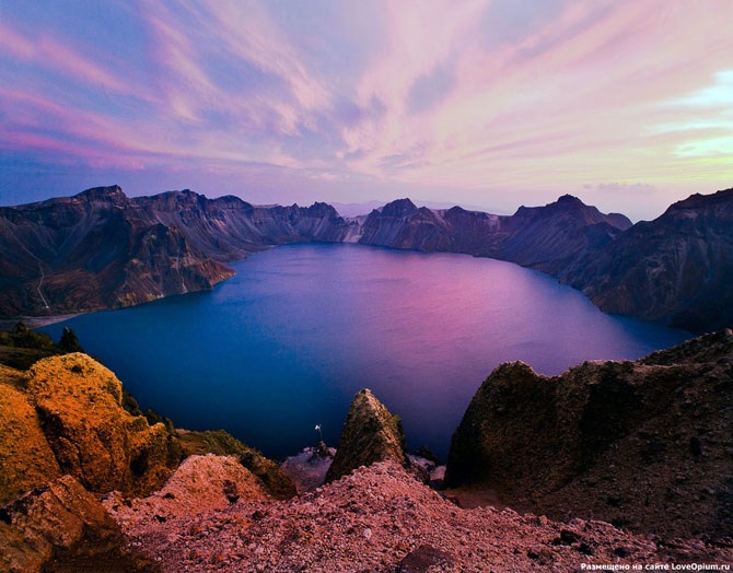 Кратерное озеро Чхонджи или Тяньчи расположено на границе КНДР и Китая. Еще его называют Небесным озером.Кратер образовался в результате сильного извержения в 970 году. Берега кратерного озера очень крутые. Вытекающая из озера река образует в стенке кратера глубокое ущелье с обрывистыми уступами, где образуются водопады. Самый большой из них находится у внешнего края кратера и имеет высоту около 50 метров.