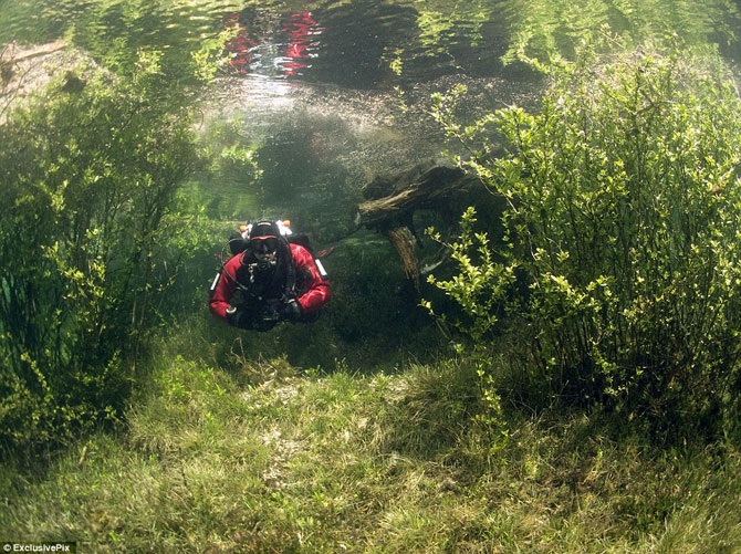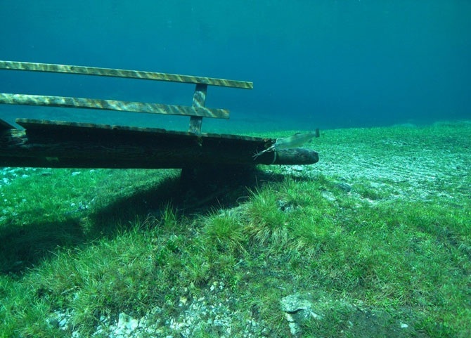 Самое необычное явление в том, что в озере плавают рыбы над деревянными скамейками, а земля покрыта зеленой травой и цветами. Пузырьки воздуха, скопившиеся на листве деревьев, искрятся всеми цветами радуги. Деревья, дороги и мосты — все это создает сюрреалистический наземный мир, но который одновременно находится под слоем воды.