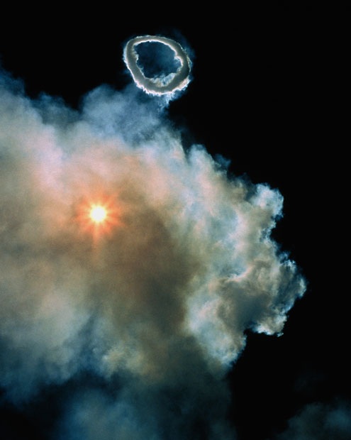 Кольцо пара, выпущенное из жерла Bocca Nova горы Этна, Сицилия. Кольца пара получаются, когда пар выбрасывается из округлого жерла вулкана. Центр кольца выбивается под действием термосилы, на его край воздействует давление окружающего воздуха. В итоге пар начинает вращаться по кругу и при благоприятных условиях через несколько минут приобретает форму кольца. Процесс очень похож на выдувание колец из сигаретного дыма.