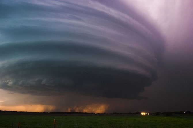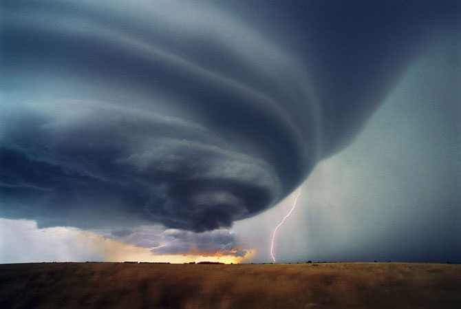 Гроза, образовавшаяся из сверхячейки торнадо, над равниной Майкрофт, Вайоминг, США. Грозы из сверхъячейки вращаются с огромной силой, создавая мощные восходящие потоки и вызывая серьезные погодные изменения, включая торнадо, град, ливни, молнии и сильные порывы ветра. Внутри этих долгих и сильных штормов скорость ветра меняется в зависимости от высоты. Из-за этого появляется вращающийся восходящий поток теплого воздуха (мезомасштабный циклон) и отдельный нисходящий поток холодного воздуха. Около трети сверхячеек вызывают торнадо.
