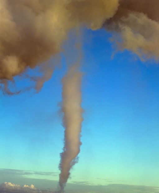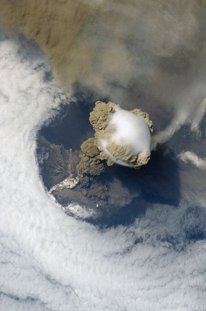 Шапка-облако во время извержения вулкана Сарычева, Курильские острова, Россия. Шапка-облако, также может называться облако-шарф или облако-шляпка, – небольшое облако, которое образуется на верхушке большого образования. На этой фотографии облако-шапка (в центре) образовалось над облаком вулканического пепла из вулкана Сарычева. Столб дыма, пара и пепла извергается из вулкана, а по его склонам спускается пирокластический поток плотного пепла. Этот снимок был делан астронавтами на Международной космической станции. Обратите внимание на безоблачную область, которая окружает вулкан, что тоже было вызвано извержением.