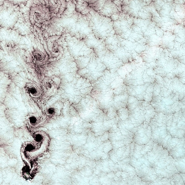 Облако Вон Кармана над островом Александр Селкерк, Чили. Эти облака выглядят так, будто в них специально сделали дырки. На самом деле это естественные воронки, которые образуются из-за вихревых потоков в облаках. На этой фотографии воронку в облаке (закручивается в левой части снимка) образовывает горная вершина на острове Александр Селкерк (слева снизу), которая как бы разрывает движимое ветром облако. Снимок сделан датчиком Enhanced Thematic Mapper Plus на спутнике NASA Lansat 7.
