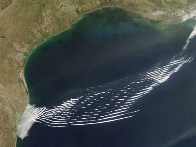 Облака гравитационной волны над Мексиканским заливом, Техас, США. Эти облака, похожие на зыбь на воде, чаще всего образуются над океаном. Эффект зыби получается из-за движения области с высоким давлением и холодного фронта. Плотный воздух поднимается к более разреженному, образуя гребень волны. Гравитация тянет плотный воздух назад, что образует впадину. Эта фотография была сделана прибором Moderate Resolution Imaging Spectroradiometer (MODIS) на спутнике NASA.