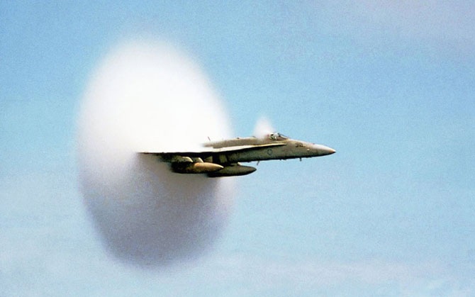 Облако от преодоления американским истребителем F/A -18 Hornet звукового барьера над Тихим океаном. Этот самолет не пролетает через облако, он сам его создает, приближаясь к скорости звука (768 миль в час). В то время как самолет двигается в воздухе, за ним образовывается область с низким давлением. Когда давление в ней падает ниже давления газообразной воды, вода в воздухе конденсируется и образуется облако.