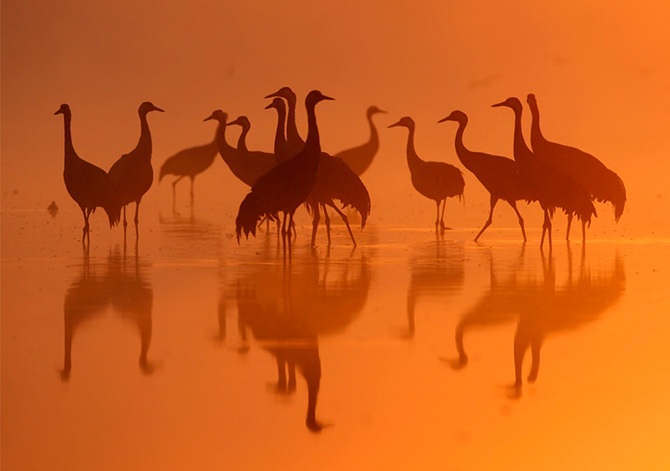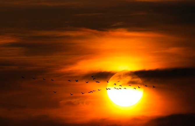 Стая серых журавлей на Мекленбургских озерах, Германия. С сентября по ноябрь десятки тысяч журавлей останавливаются в сельских районах Германии во время зимней миграции из Скандинавии и Восточной Европы в Испанию.
