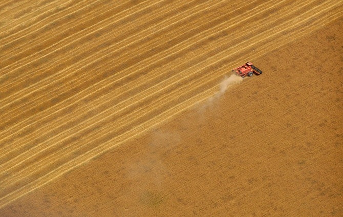 Комбайн собирает пшеницу в поле, к югу от Чапмана, штат Канзас, США.