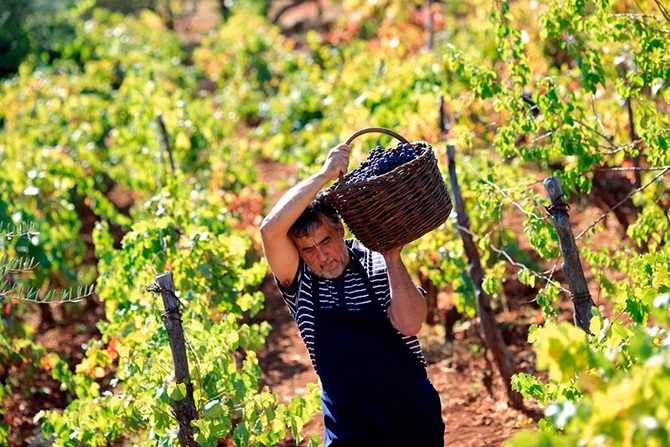 Мужчина несет корзину с виноградом, остров Брак, Хорватия.