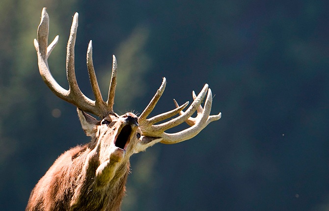 Самец благородного оленя испускает вой, Тироль, Австрия.