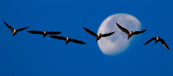 Дикие гуси летят над Шотландией. Каждый год около 20 тыс. диких гусей останавливаются осенью в этой местности во время миграции из Исландии на юг.