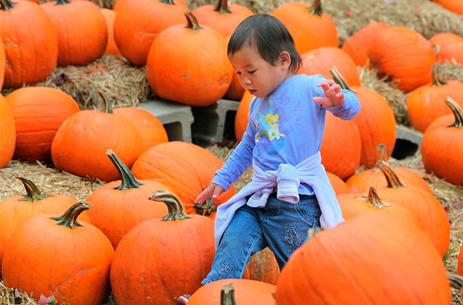Мальчик гуляет среди спелых тыкв на ферме Коннорс в штате Массачусетс, США